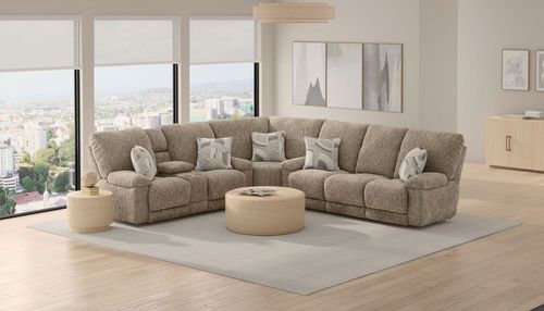 Discover the cozy charm of the Beacon 3-piece Reclining Sectional. The Beacon Sectional features a sofa with soft chenille fabric, padded pillow arms with storage and manual recliners with extended ottomans. The sofa also includes a practical drop-down table. Pair it with the lighted console loveseat, offering padded arms with storage, manual recliners, power plugs and USB ports.